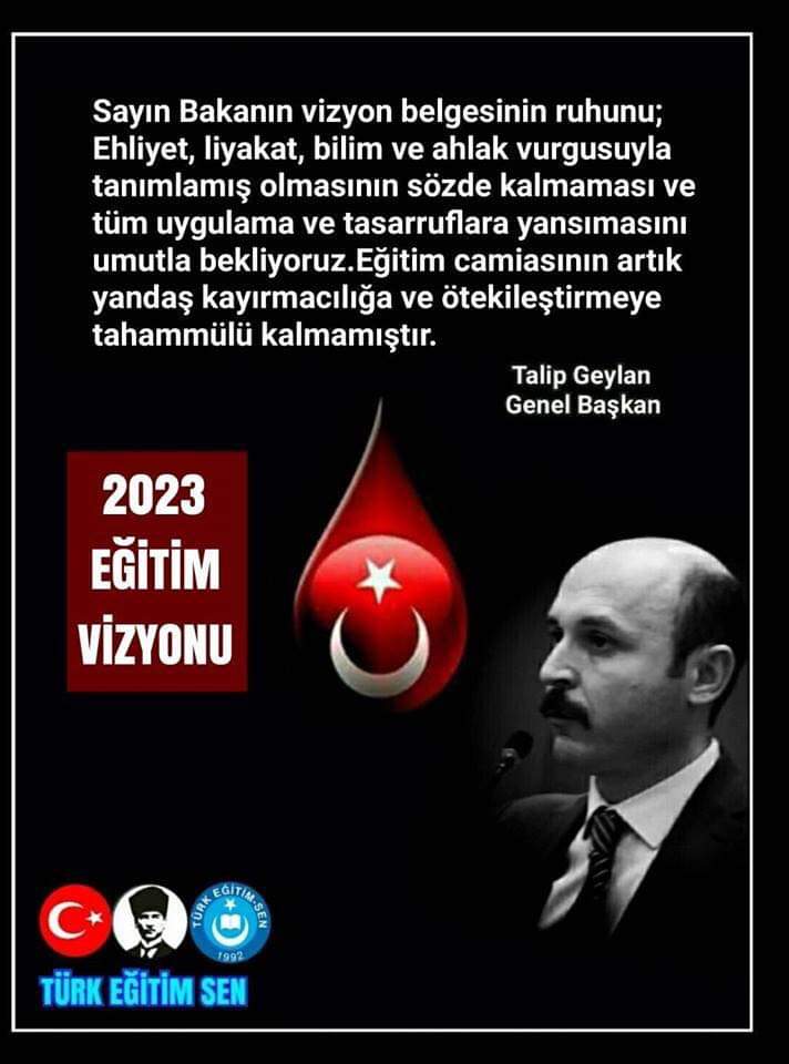Sayın Bakanın vizyon belgesinin ruhunu; EHLİYET, LİYAKAT, BİLİM VE AHLAK vurgusuyla tanımlamış olmasının sözde kalmaması ve tüm uygulama ve tasarruflara yansımasını umutla bekliyoruz. Eğitim camiasının, artık, yandaş kayırmacılığa ve ötekileştirmeye tahammülü kalmamıştır.