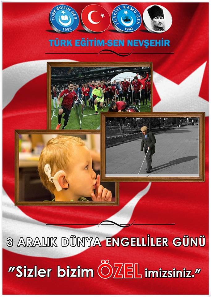Türk Eğitim Sen Nevşehir Şube Başkanı Tayfur Urgenç;3 Aralık Dünya Engelliler Günü ile ilgili “Sizler Bizim Özelimizsiniz” başlıklı toplumsal duyarlılık mesajı yayınladı. Mesajında Engellilerin Özel İnsan olarak kabul edilmesi gerektiğini belirtti. Engelli Bireyler Bizim Özelimizdir. dedi.