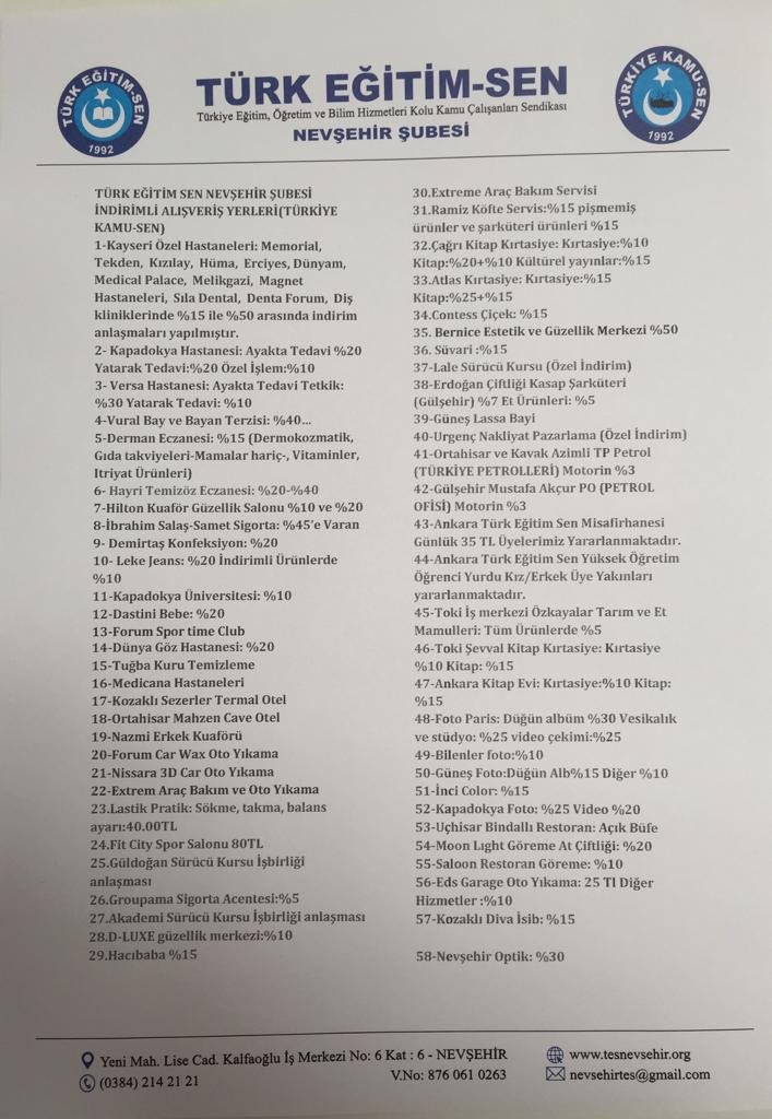 Duyurular • Haberler • Türk Eğitim-Sen Nevşehir • Üye Fırsatları İNDİRİM ANLAŞMAMIZ OLAN İŞ YERLERİ Haziran 1, 2019 Tayfur Urgenç Paylaş Facebook Twitter İlgili İçerikler Duyurular • Haberler • Türk Eğitim-Sen Nevşehir CİMER BAŞVURULARI KAMU ÇALIŞANLARI İÇİN MOBBİNGE DÖNÜŞTÜ. 7 gün ago Duyurular • Haberler • Türk Eğitim-Sen Nevşehir ÖĞRETMENLERİ DİJİTAL ANGARYA İLE MEŞGUL ETMEYİN. 7 gün ago Duyurular • Haberler • Türk Eğitim-Sen Nevşehir TÜRK EĞİTİM SEN NEVŞEHİR ŞUBESİ YENİ YÖNETİM KURULU GÖREV DAĞILIMI GERÇEKLEŞTİ. 2025-2029 4 hafta ago BİR EĞİTİM VE ÖĞRETİM YILINI DAHA GERİDE BIRAKIYORUZ. İL BAŞKANI TAYFUR URGENÇ MEM VE ÜNİVERSİTE YÖNETİMİNE TEŞEKKÜR ETTİ. Paylaş Facebook Twitter