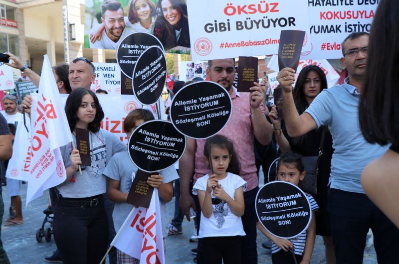 Sözleşmeli öğretmenler, “Ailemle Yaşamak İstiyorum”, “Kadro Gelecek Kölelik Bitecek”, “Babamın Tişörtü İle Değil Babamla Uyumak İstiyorum”, “Çocuklarımız Yetim Gibi Öksüz Gibi Büyüyorlar”, “Bana Bir Masal Anlat Baba”, “Sınıf Tahtalarımız Ağlama Duvarımız Oldu”, “Kırmızı Çizgimiz Ailemiz”, “Ziya Hocam Sözleşmeli Öğretmen A-i-le-siz” şeklinde pankartlar taşıdı; “Sözleşmeli Köleliğe Hayır”, “Bakan Bizi Ayırma”, “İnternet Evliliği İstemiyoruz”, “Evli, Mutsuz, Çocuksuz” sloganları attı.