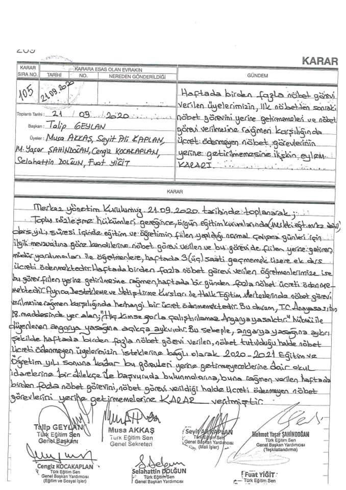 1-Mesai Saatleri Dışındaki Angarya Görevleri Yerine Getirmeme Eylem Kararı
