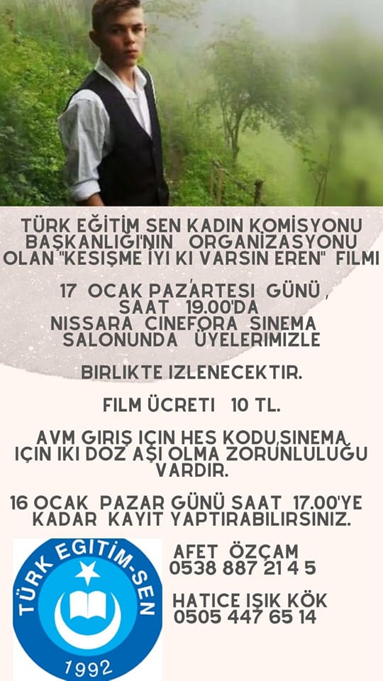 Türk Eğitim Sen Nevşehir Şubesi üyeleri Kadın Komisyon Başkanlığımızın organizasyonu ile Kesişme iyi ki varsın Eren filminde 17 Ocak Pazartesi Günü Saat:19.00 Nissara CineFora sinema salonunda isteyen tüm üyelerimizin katılımı ile topluca izlenecektir. Film ücreti 10 TL olacaktır. Filmi izlemek isteyenler 16 Ocak pazar günü saat 17.00’a kadar katılım gösterecekleri kişi sayısını kadın Komisyon başkanı Afet Özçam’a 0538 887 2145 veya kadın Komisyon Başkan yardımcısı Hatice Işık Kök’e 0505 447 6514 nolu telefondan iletişim kurarak bildirmeleri gerekmektedir.