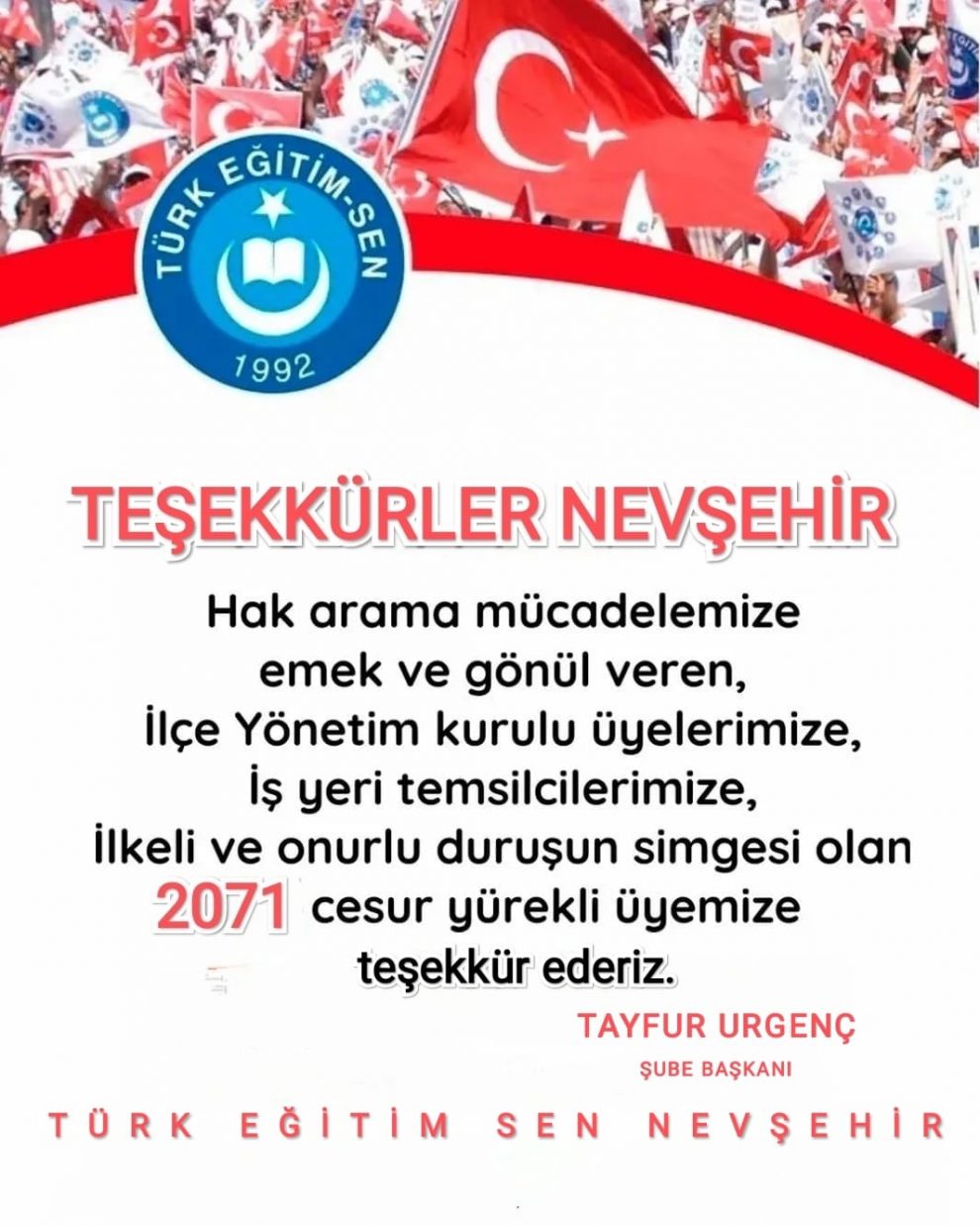 Türk Eğitim Sen Nevşehir şube başkanı Tayfur Urgenç 15 mayıs yetki süreci çalışmalarının il mutabakat metninin imzalanması ile tamamlandığını belirterek kamuoyu ile üye sayılarını paylaşarak teşekkürler Nevşehir başlığı ile bir açıklama yayınladı.