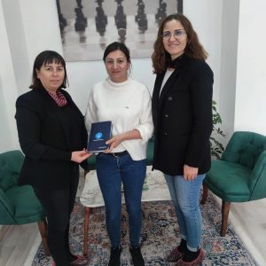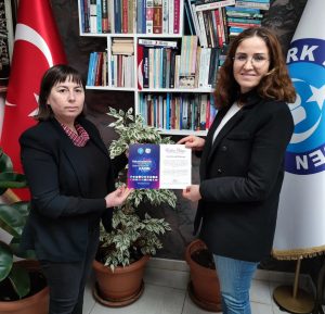 Tes. Nevşehir şube başkanı Tayfur Urgenç ve kadın komisyon başkanı Afet Özçam; Türk Eğitim Sen tarafından organize edilen  Türk Dünyasında Sosyal Hayat ve Çalışma Hayatında Kadın Kurultayına katılarak sunmuş oldukları raporlardan dolayı Türk Eğitim genel başkanı Talip Geylan tarafından gönderilen katılım belgeleri Afet Özçam,  Hatice Işık Kök, Sibel Yaşa, Zeynep Gömbel, Canan Sırakaya’ya takdim etti. Başkan Urgenç; katılımcılara Atatürk’ün şu feciz sözünü söylerek, “Vatanını en çok seven görevini en iyi yapandır.” Teşekkür etti.