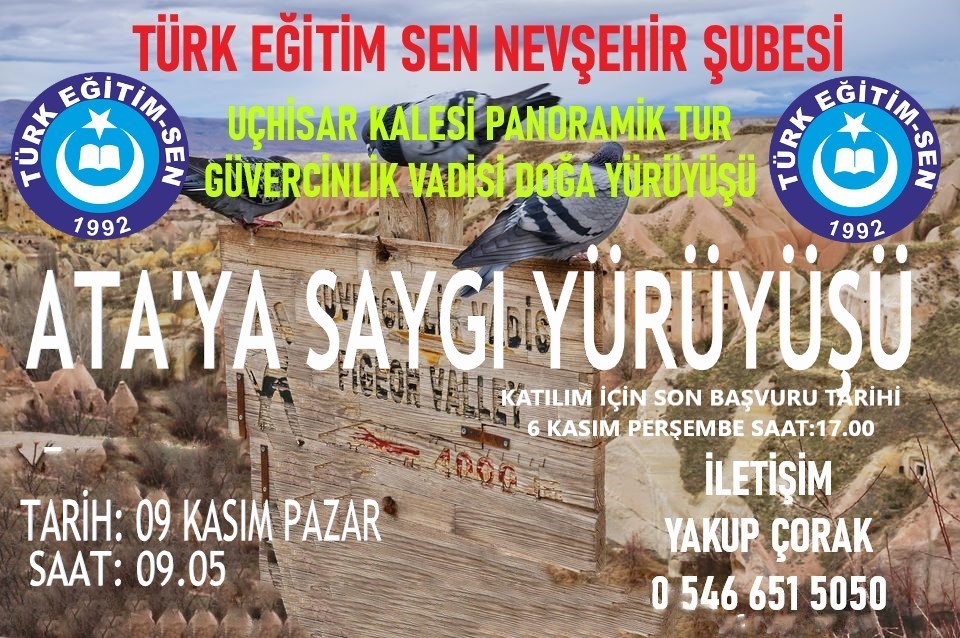 Türk Eğitim Sen Nevşehir şube başkanı Tayfur Urgenç Türk Eğitim Sen Nevşehir Şubesi olarak Kapadokya’nın en güzel vadisini birlikte adımlamaya var mısınız? Kuş sesleri, arasında güvercinlerin kanat çırpmasının ahengiyle, atamıza duyduğumuz minnet ve özgürlüğümüze, milli mücadeleye ve devletimize duyduğumuz sadakatle, Ulu Önder Atatürk’e duyduğumuz özlem ve sevgi ile tarihe şahitlik etmeye var mısınız? ifadesiyle tüm eğitim çalışanlarını ATA’YA SAYGI YÜRÜYÜŞÜNE davet etti.