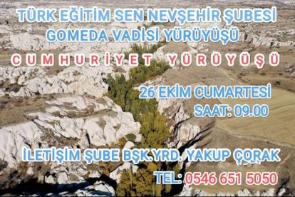 GOMEDA VADİSİNDE CUMHURİYET VE DOĞA YÜRÜYÜŞÜ GERÇEKLEŞTİRECEĞİZ. Türk Eğitim Sen Nevşehir Şubesi olarak Ürgüp- Mustafa Paşa’da bulunan Gomeda Vadisinde...